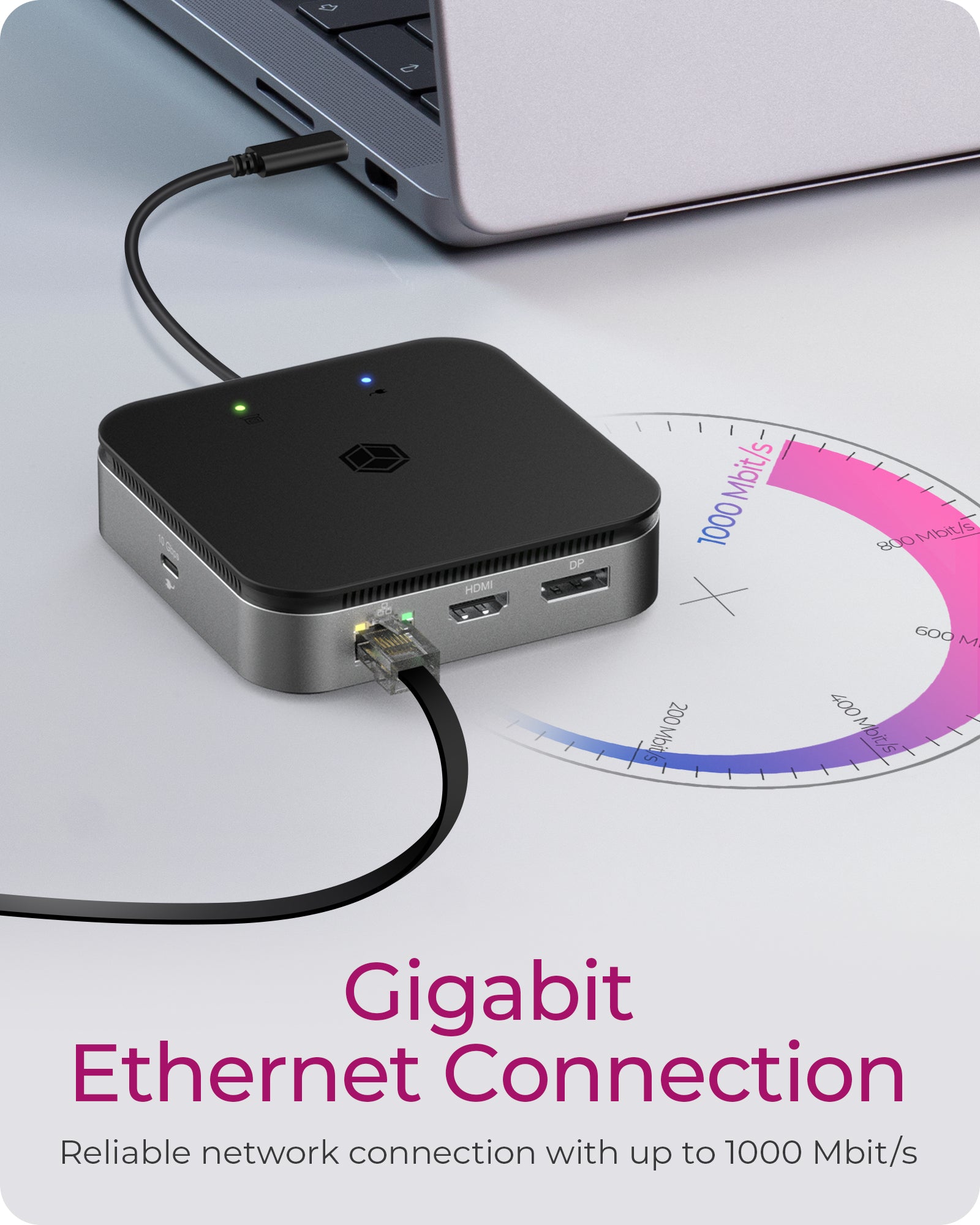 Gigabit Ethernet Connection: The DockingStation is equipped with a Gigabit Ethernet port. This feature offers a reliable network connection with up to 1000 Mbit/s which is essential for application areas that require a fast internet performance