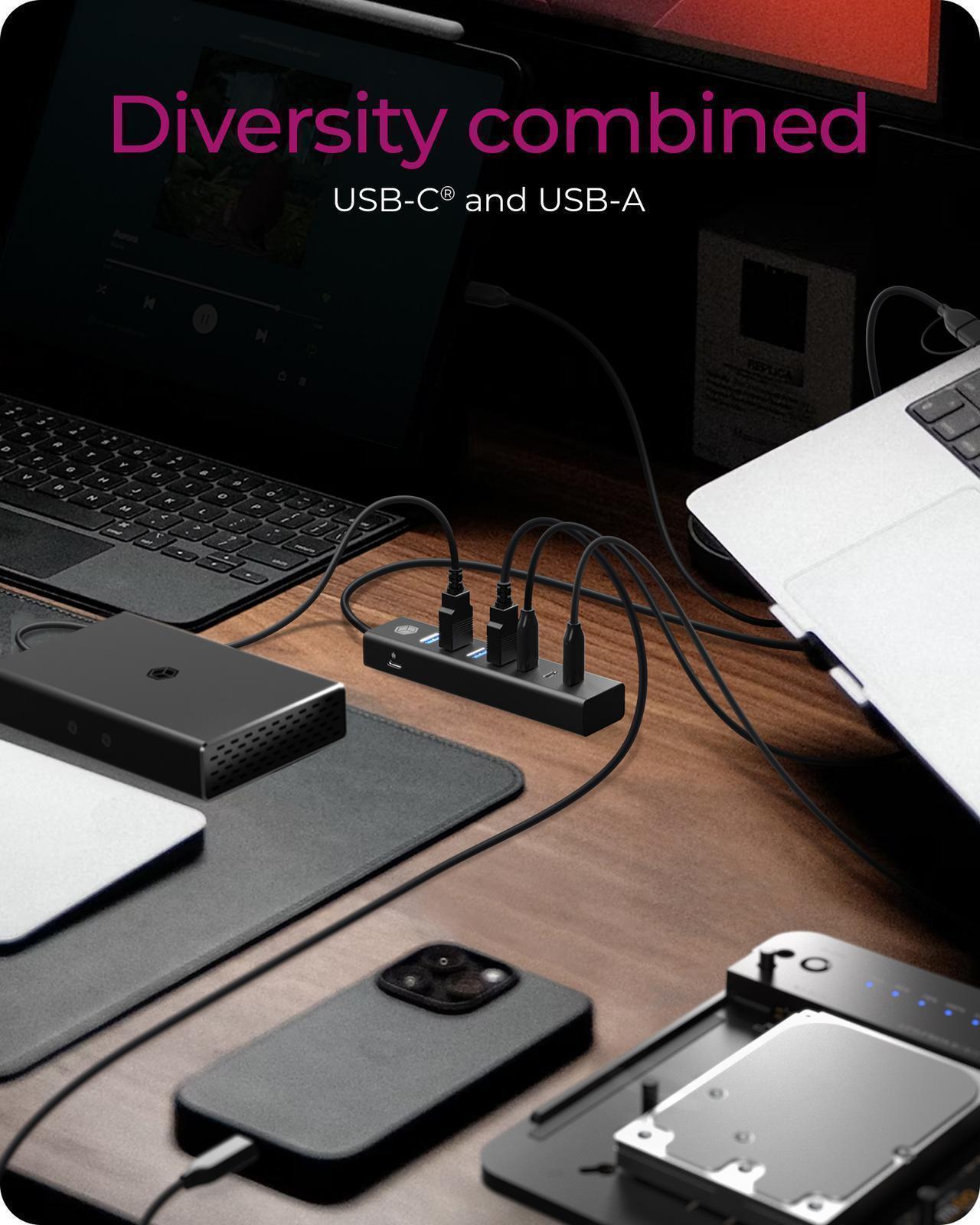Diversity Combined - The 7-port USB 3.2 Gen 1 hub features 4 USB-C and 3 USB-A connections, allowing you to connect nearly all USB devices. This versatility ensures you’re covered for various connectivity needs.