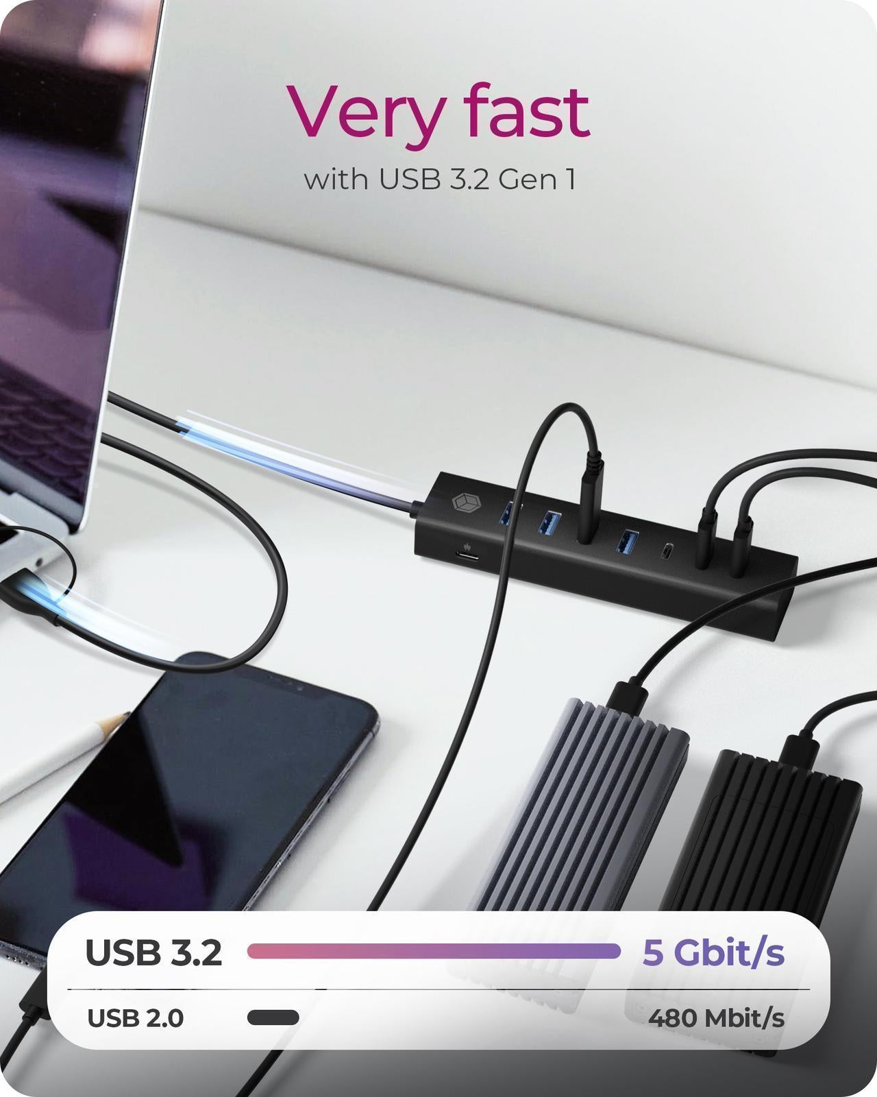 Very Fast - Achieve data transfer speeds of up to 5 Gbit/s with USB 3.2 Gen 1, making it easy to transfer large files quickly. The hub is also backwards compatible, ensuring older devices can be used safely.