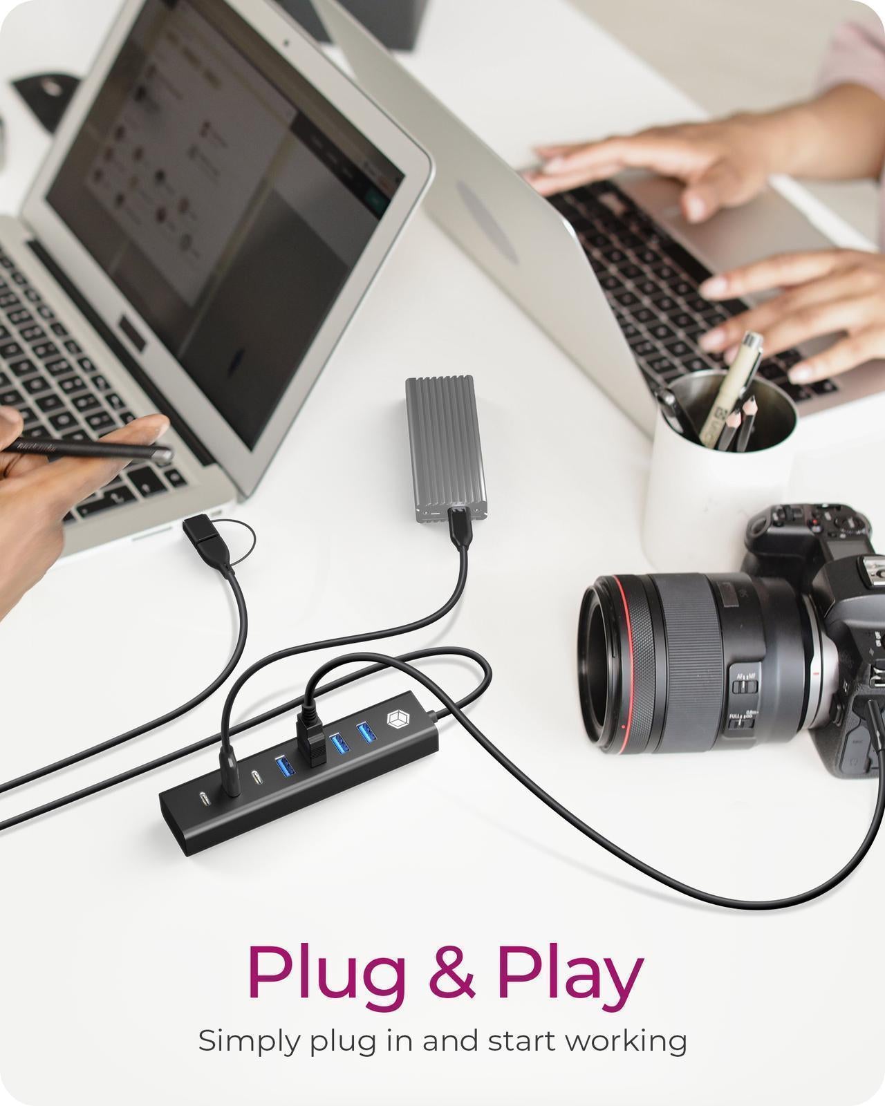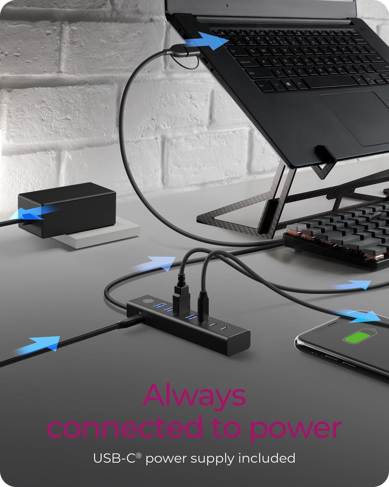 Always Connected to Power - Included with the hub is a USB-C power supply, ensuring it always has enough power for all ports. This feature supports even energy-intensive devices without hassle.