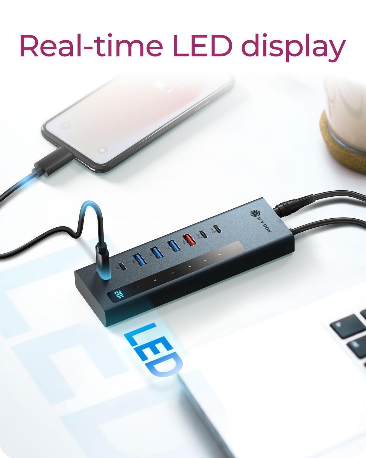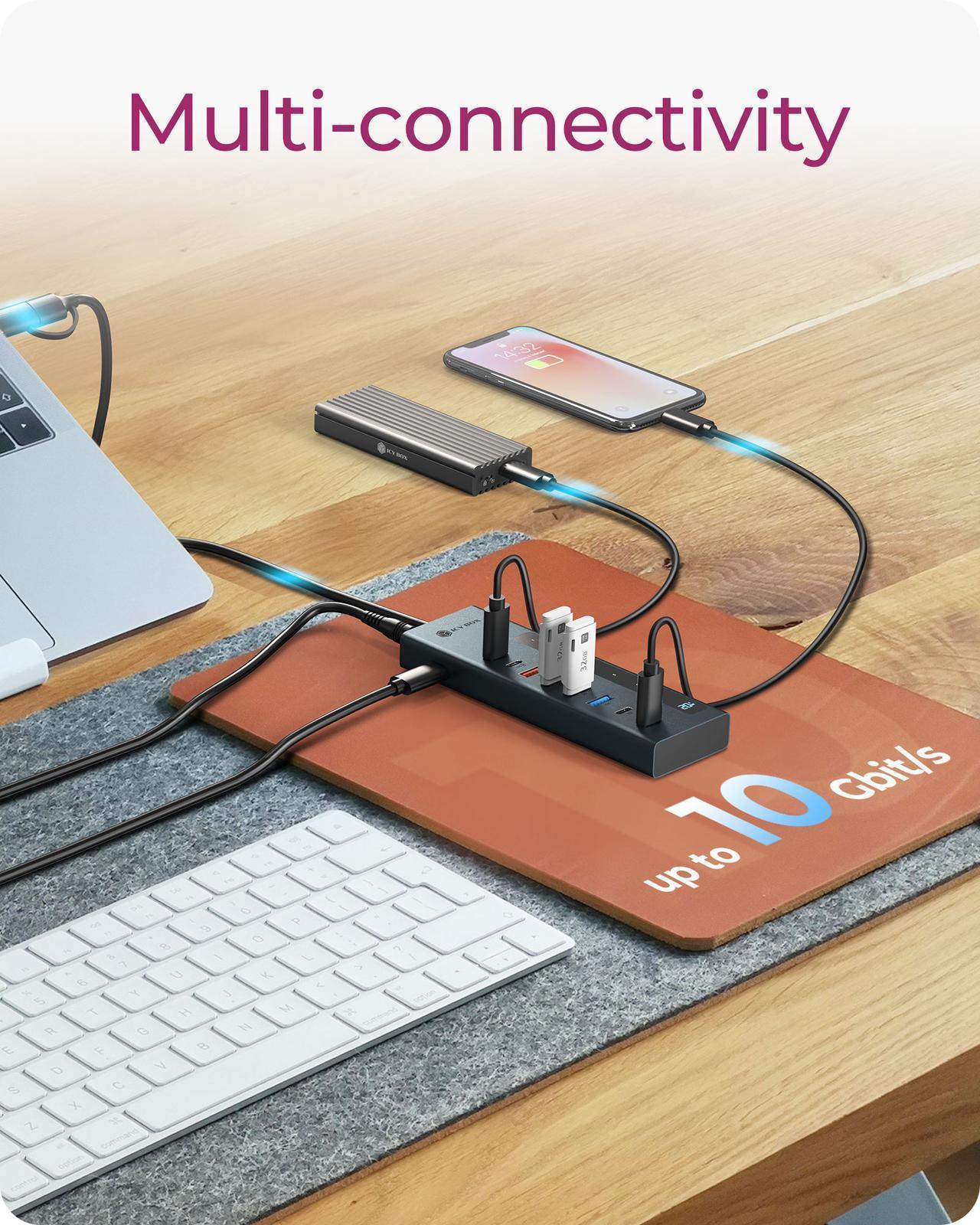 Transfer data at speeds up to 10 Gbit/s via USB 3.2 Gen 2 ports. The upstream PD port delivers up to 100 W, while a separate 20 W port charges your other devices.