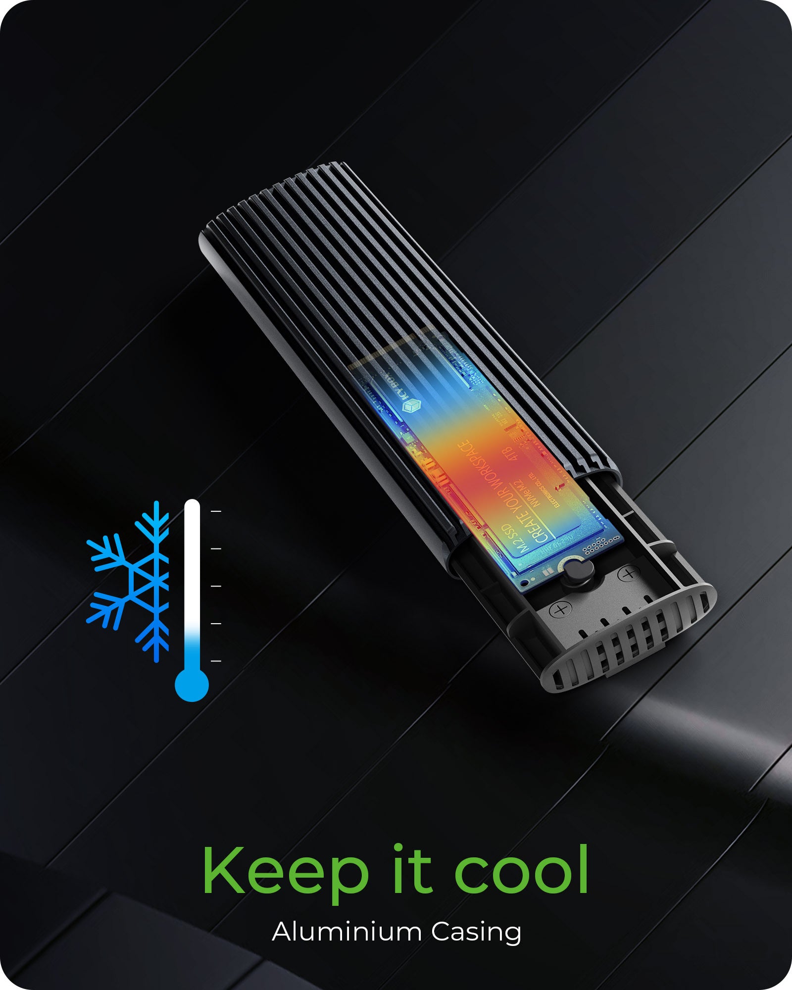 Effective Heat Control - Designed for steady performance, the aluminum housing features a heatsink casing and includes a 2mm thermal pad for improved heat transfer. Even under load, temperatures remain within a tolerable range, helping protect your SSD from slowdowns or damage due to overheating during large file transfers or heavy use.