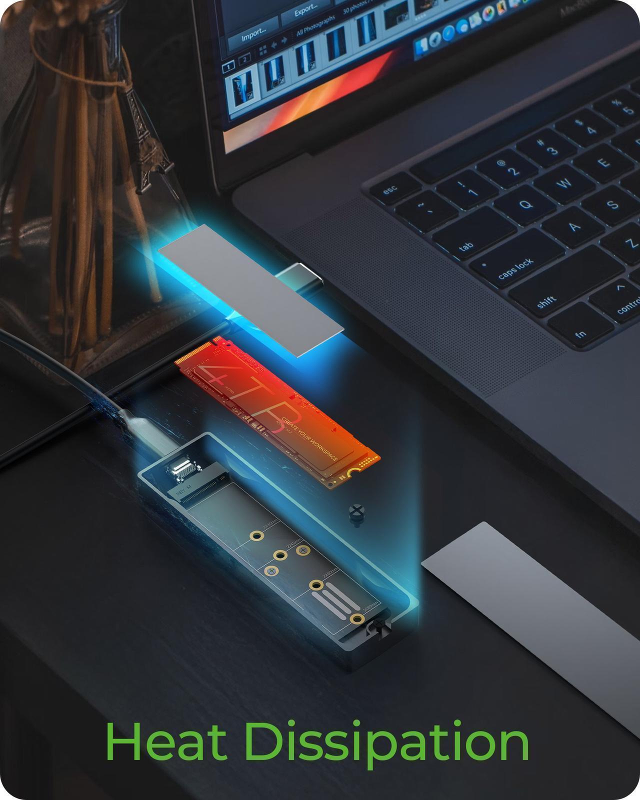 An included thermal pad efficiently transfers heat from the SSD to the enclosure, helping maintain stable performance during intensive use.