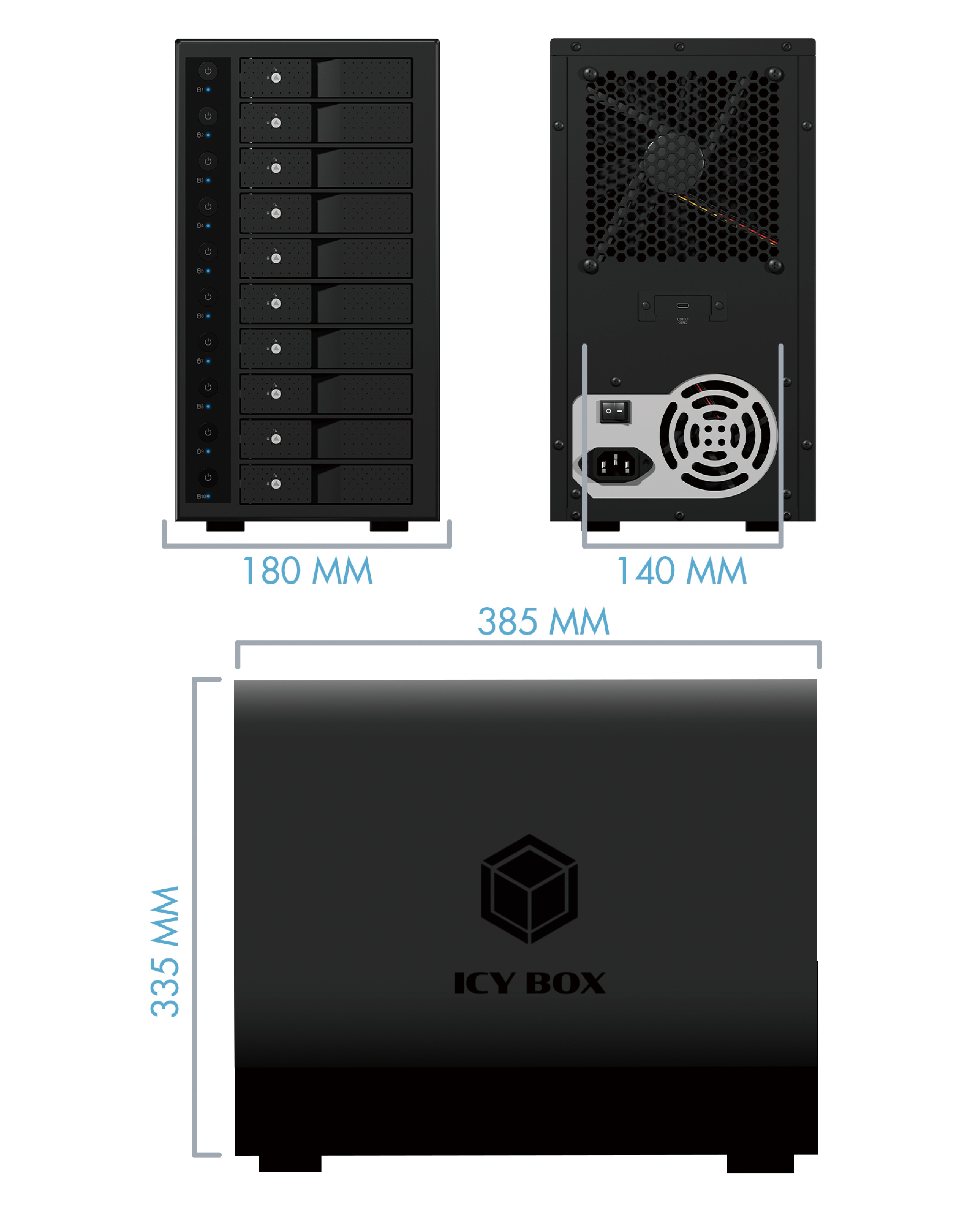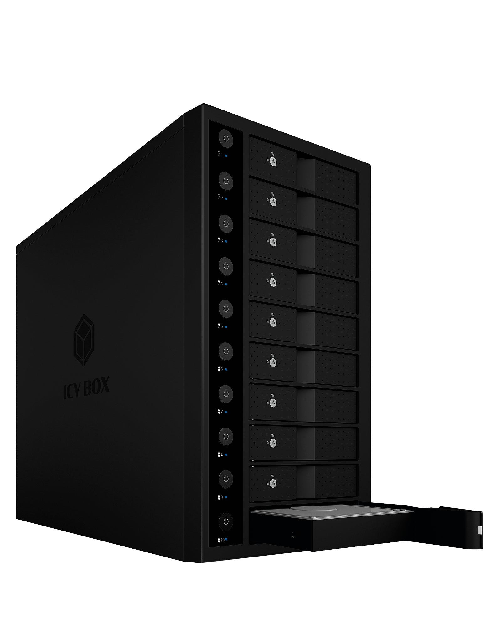Comfortable setup The IB-3810-C31 offers convenient functions: Enjoy the trayless hard disk installation with Plug & Play and HotSwap function and the energy-saving standby mode. LEDs provide information on operation and hard disk access. USB 3.1 (Gen 2) interfaces with UASP support apply to all 10 hard drive bays of this SINGLE system, as well as the operation of hard drives without any capacity restrictions.