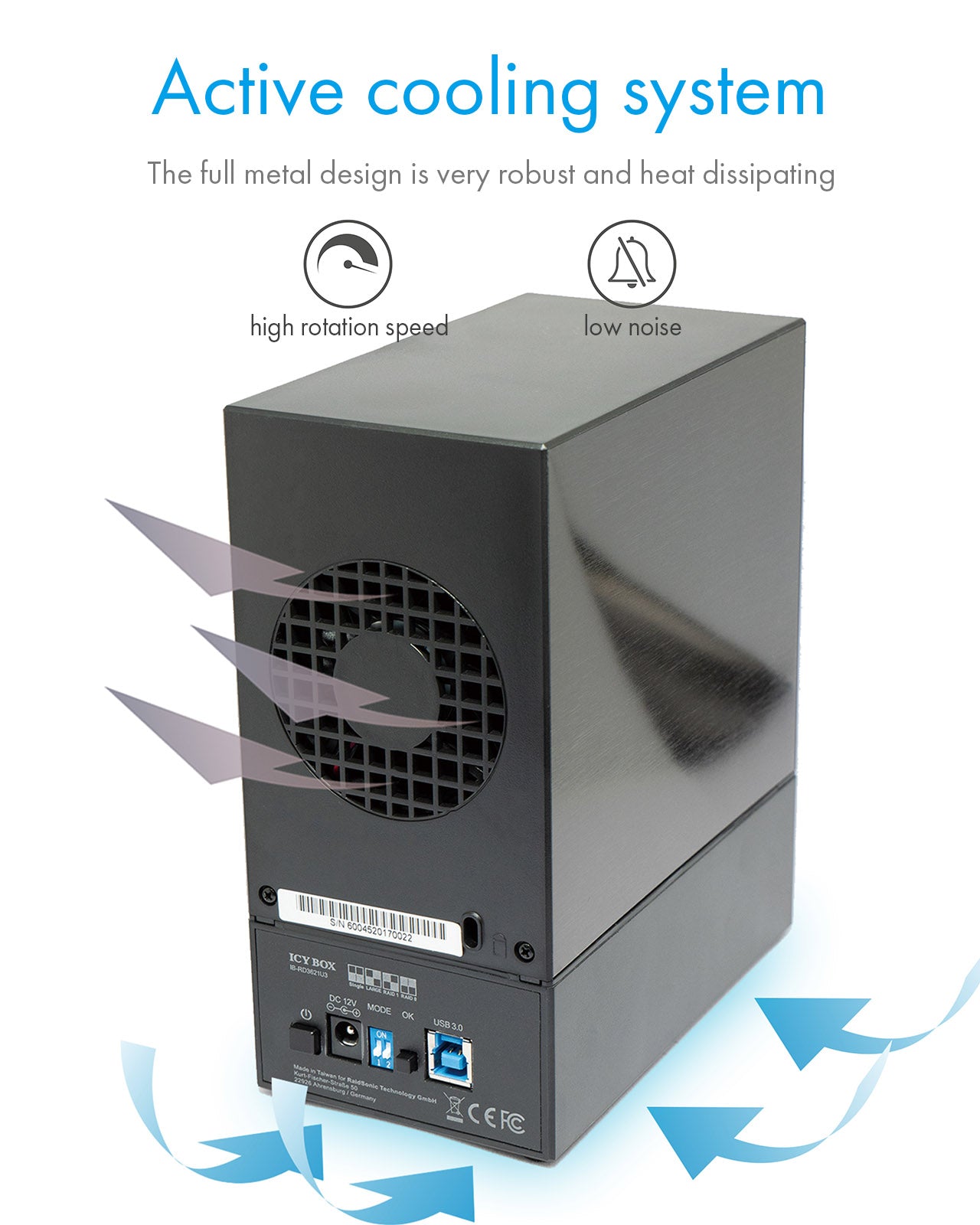 COOLING: The hard disks always remain cool in the enclosure, as the heat generated is excellently transported out of the enclosure by a 60 mm fan, thus ensuring super performance