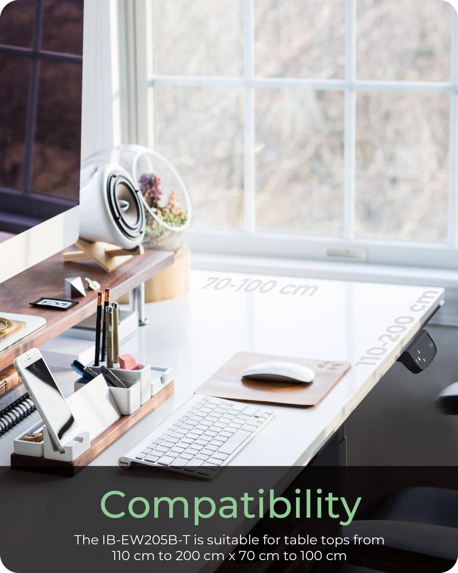 COMPATIBILITY: The IB-EW205B-T is suitable for table tops from 110 cm to 200 cm x 70 cm to 100 cm. It also has a width adjustment range from 100 cm to 170 cm (ATTENTION: Table top not included)