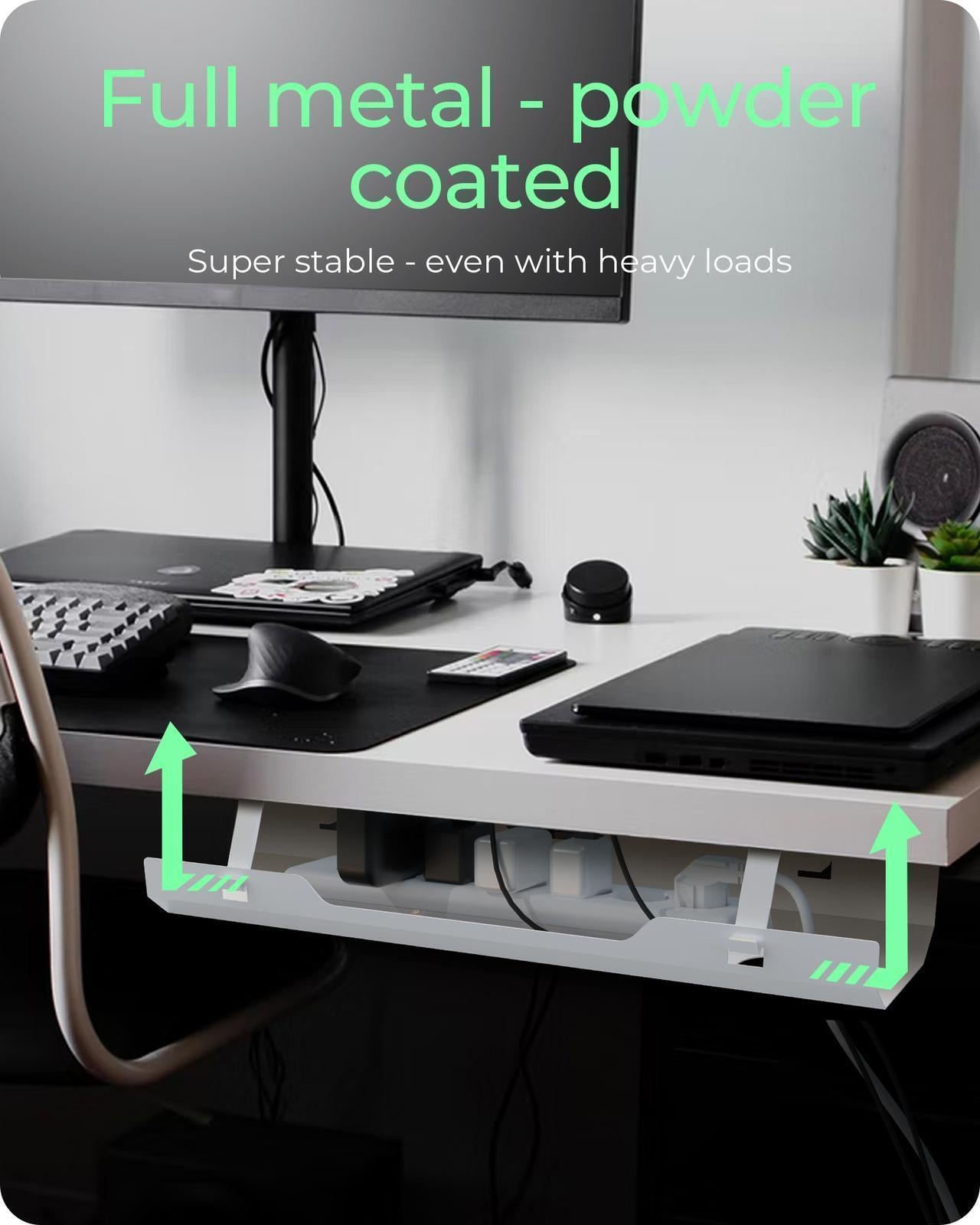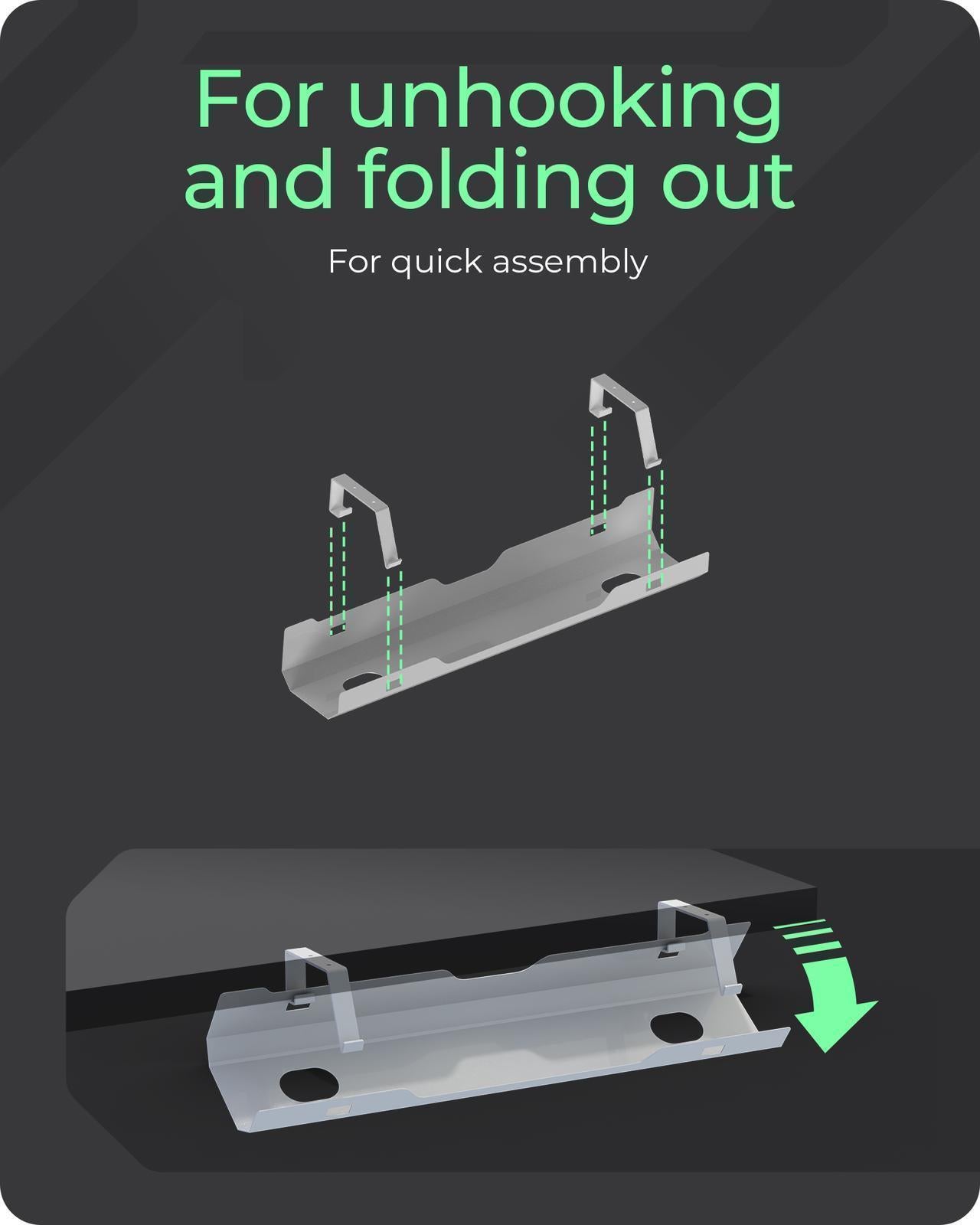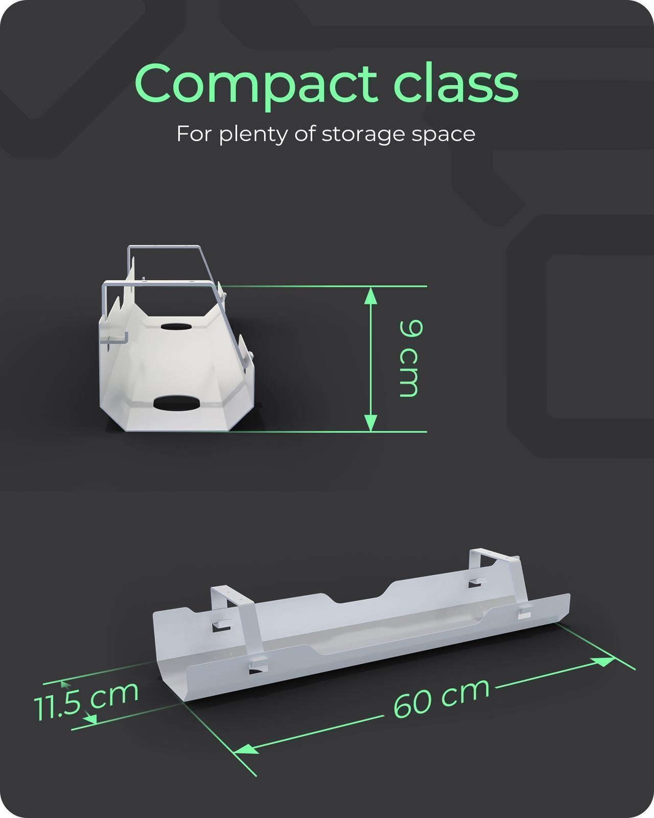 Due to the open construction, the cable tray can be easily attached to the underside of the desk and thus offers the optimal storage space for extension cables, sockets and the like. As both ends of the tray are open, it makes it easier to stow or lay cables.