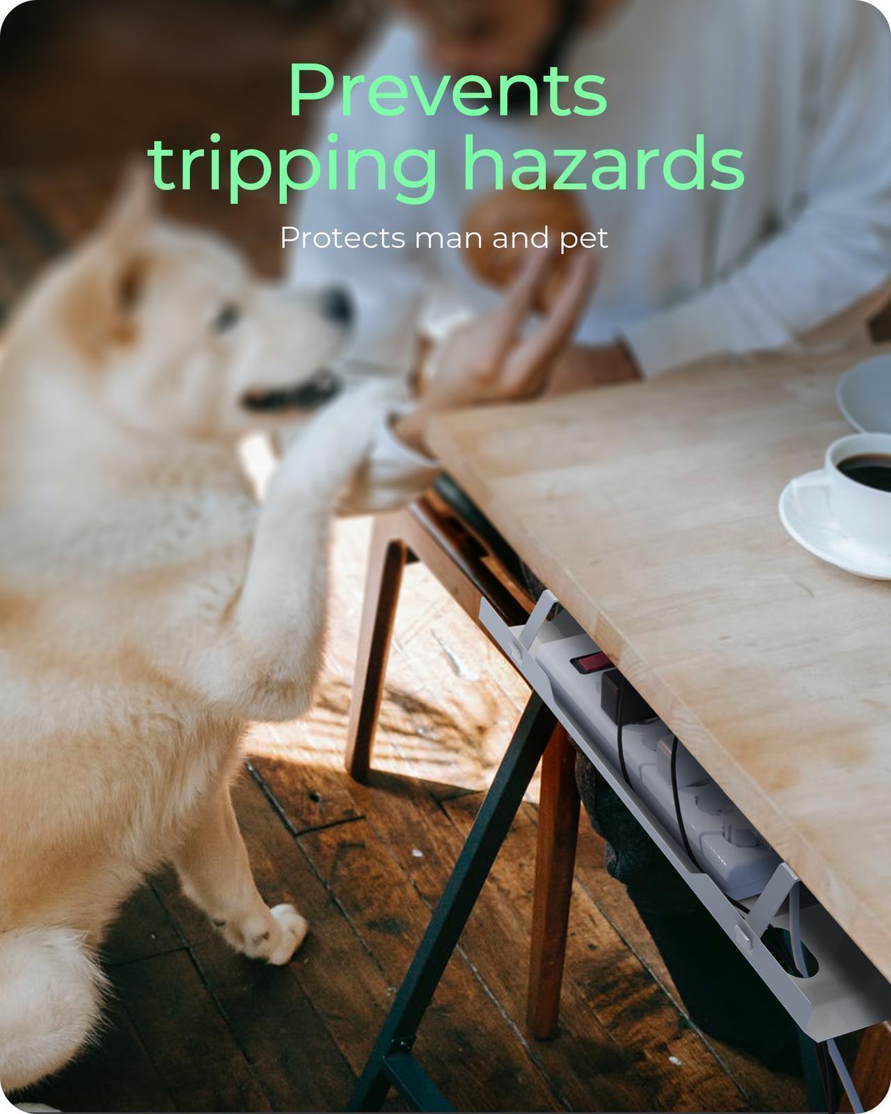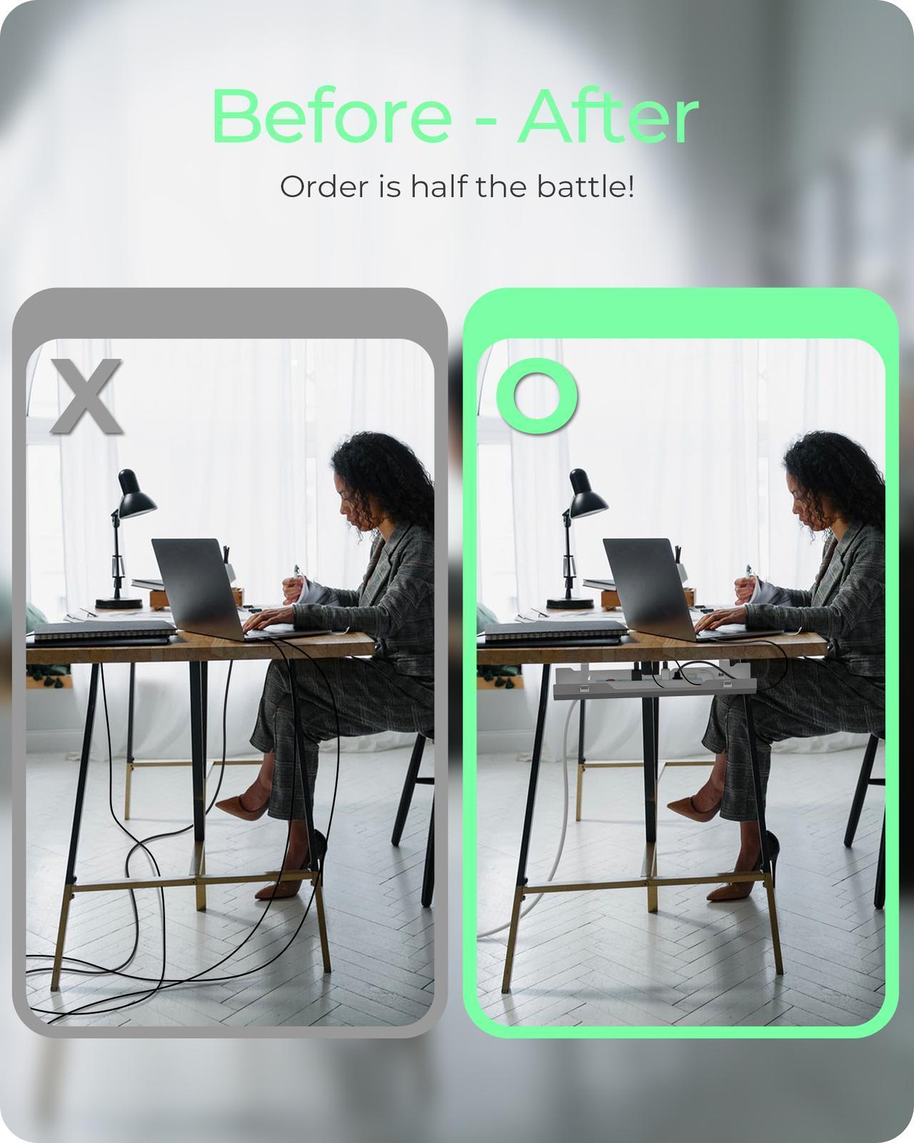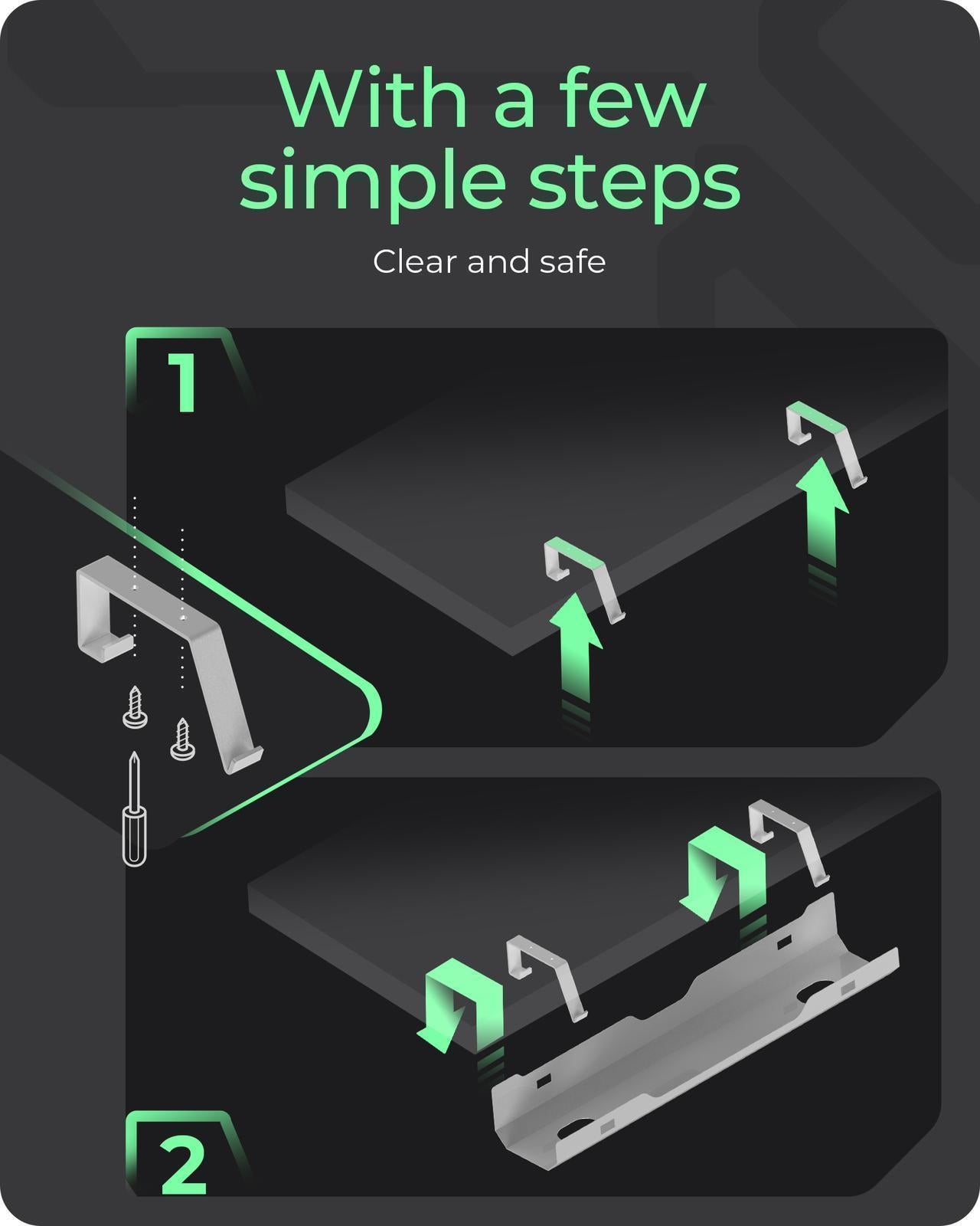 Due to the open construction, the cable tray can be easily attached to the underside of the desk and thus offers the optimal storage space for extension cables, sockets and the like. As both ends of the tray are open, it makes it easier to stow or lay cables.