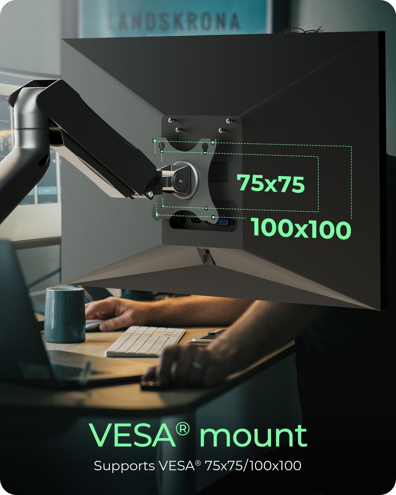 VESA mount: Supports VESA mounts of 75x75 mm and 100x100 mm. With an arm height adjustment of up to 406 mm and an arm height adjustment range of 248 mm, it is suitable for various desk configurations