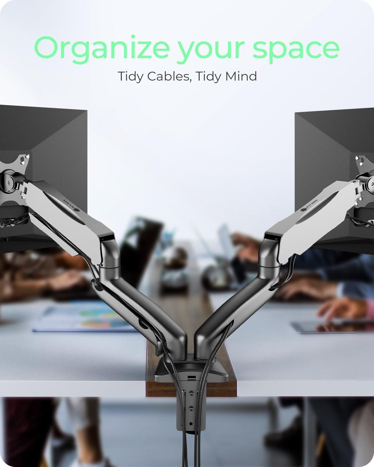 Dual Monitor Desk Mount - Crafted from a sturdy mix of steel, plastic, and premium aluminum, this dual monitor mount offers exceptional stability for two monitors. Each monitor can be up to 32 inches and weigh between 2 to 9 kg, providing a reliable platform for your workspace.