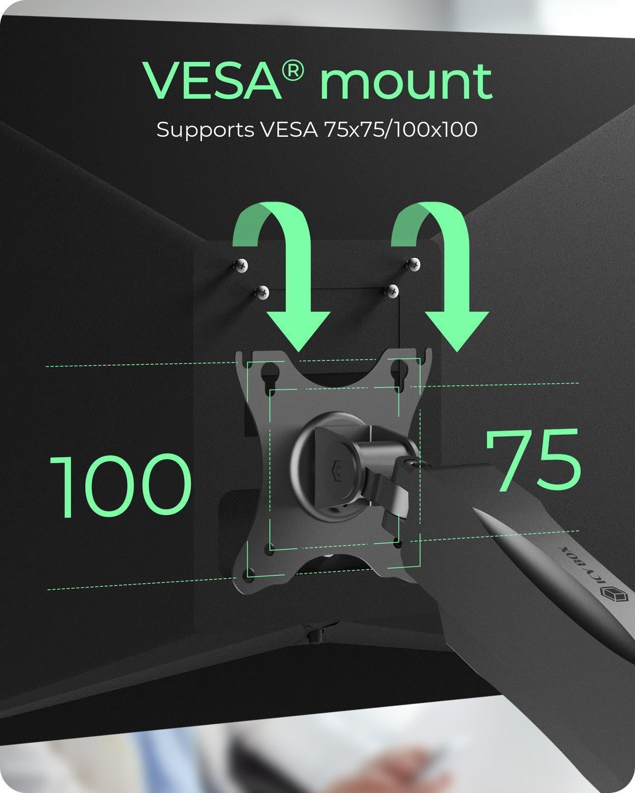VESA® Mount - Compatible with VESA® 75x75 mm and 100x100 mm mounting patterns, this mount maximizes desk space with an adjustable arm height of up to 406 mm. Its versatility accommodates various desk configurations while keeping your workspace organized.