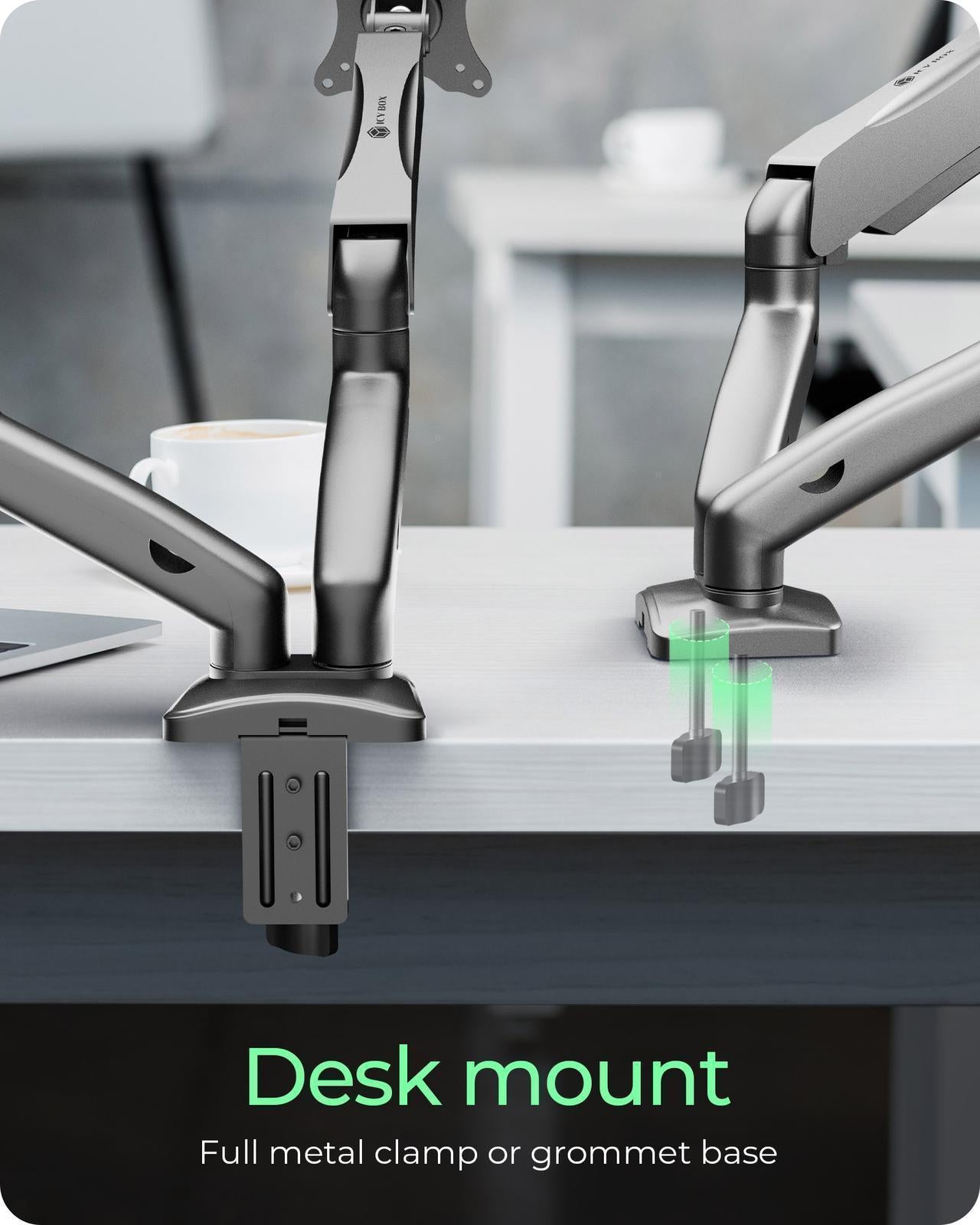 Desk Mount - The dual monitor mount features a full metal clamp or grommet base for secure attachment. Each arm supports monitors weighing up to 9 kg, ensuring stability and safety for your setup.