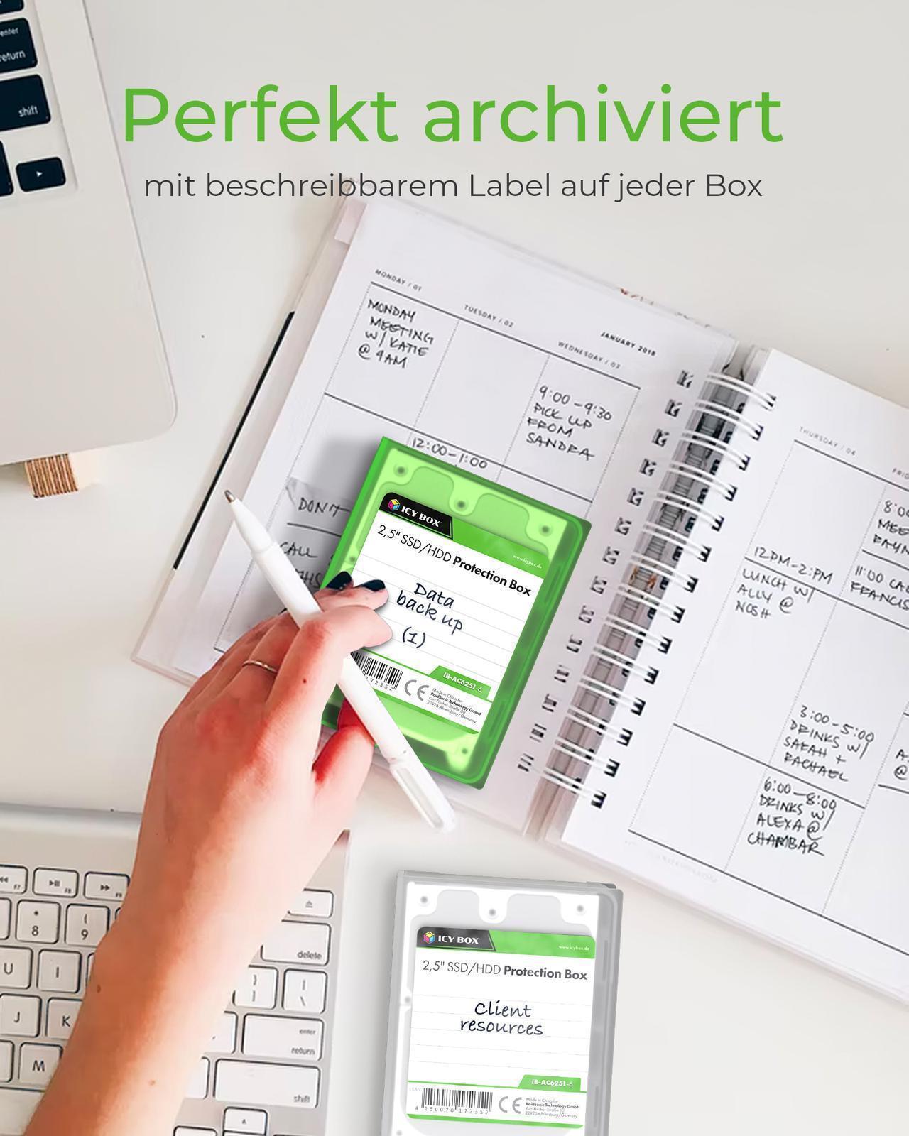 Perfekter Schutz: Ihre Datensicherungen sind mit den 6 Schutzboxen von ICY BOX optimal geschützt. Jede der sechs farbenfrohen Boxen bietet Platz für eine 3,5-Zoll-Festplatte.