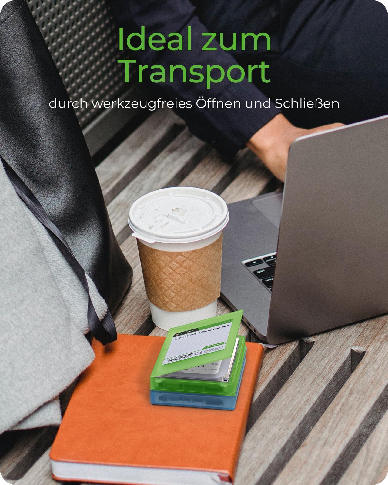 SCHNELL GESICHERT: Die farbenfrohen Festplatten-Schutzhüllen aus robustem Kunststoff lassen sich ohne weiteres Werkzeug öffnen und schließen. So sind Ihre Daten schnell und sicher verstaut.