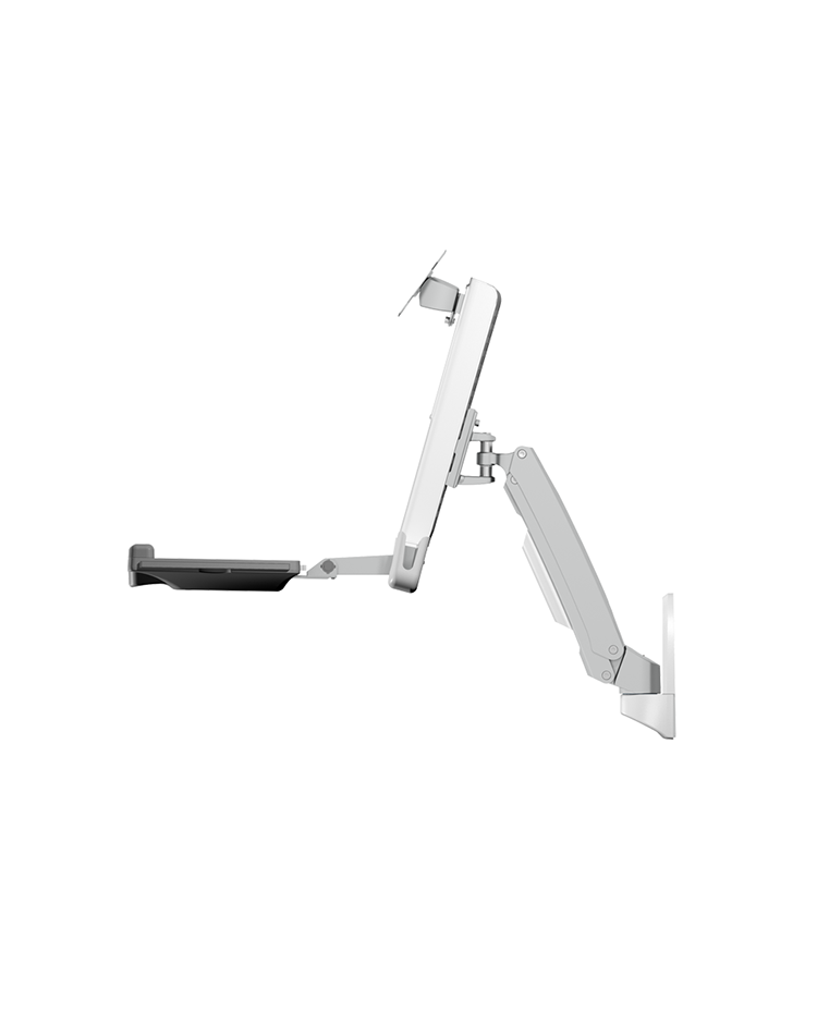Der IB-MS600-W verfügt über eine um 360° drehbare VESA-Halterung und der Arm lässt sich in verschiedenen Winkeln neigen. Um Platz zu sparen, kann die Tastaturablage hochgeklappt werden.