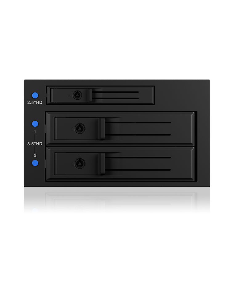 In dieses Gehäuse passen zwei 3,5"-HDDs, die in den RAID-Modi 0, 1, JBOD (Large) / Nor (SINGLE) verwendet werden können. Zusätzlich kann eine 2,5"-HDD oder SSD installiert und verwendet werden, diese ist jedoch nicht Teil des RAID-Netzwerks.