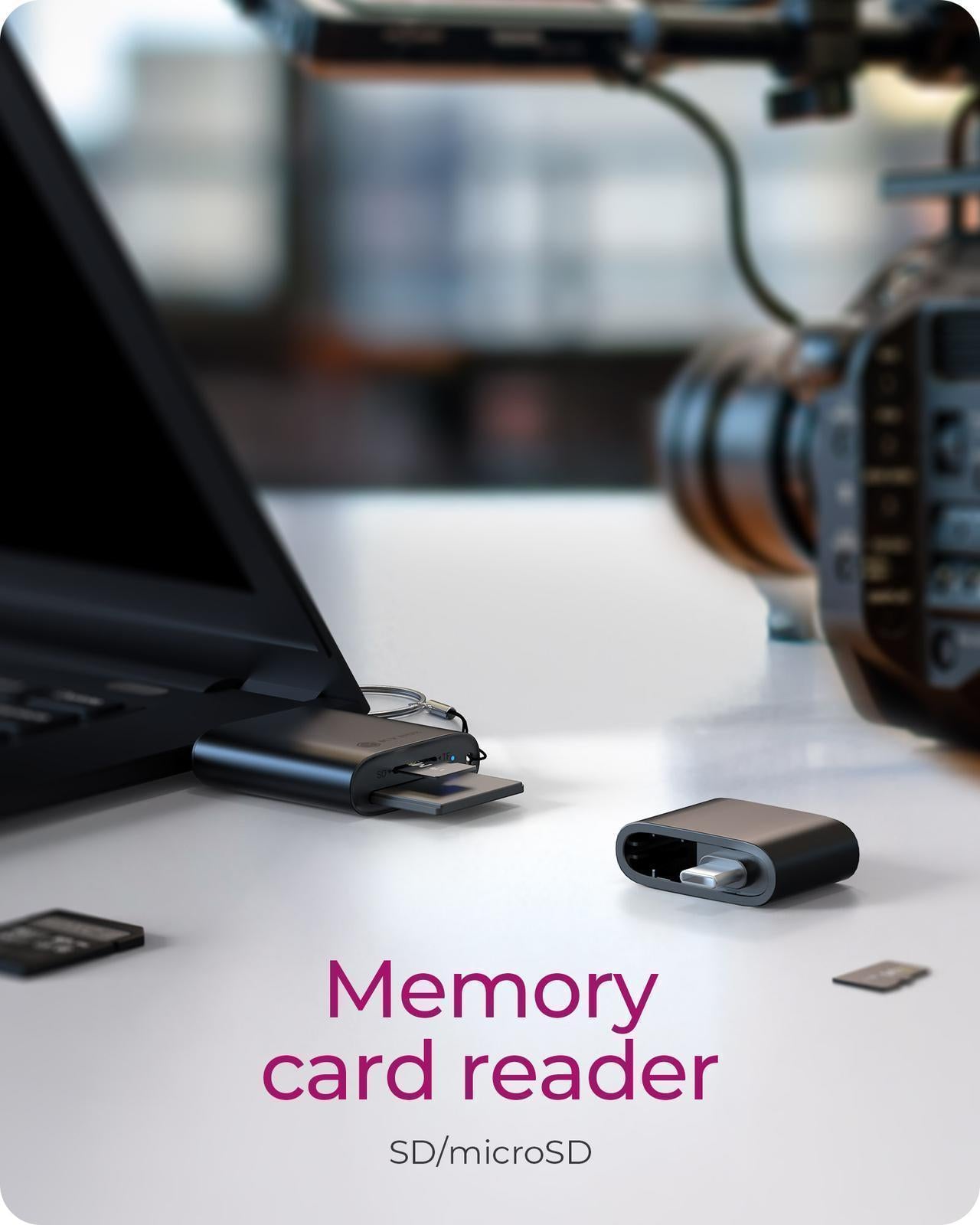 Memory Card Reader - support SD/SDHC/SDXC UHS-I (SD3.0) and microSD/microSDHC/microSDXC UHS-I (TF3.0) with transfer speed up to 104 MB/s. It allows you to transfer photos from a camera, files from a phone, or documents from other devices with ease. Compatible with the most commonly used card formats, this convenience eliminates the need for multiple adapters, saving time and effort.