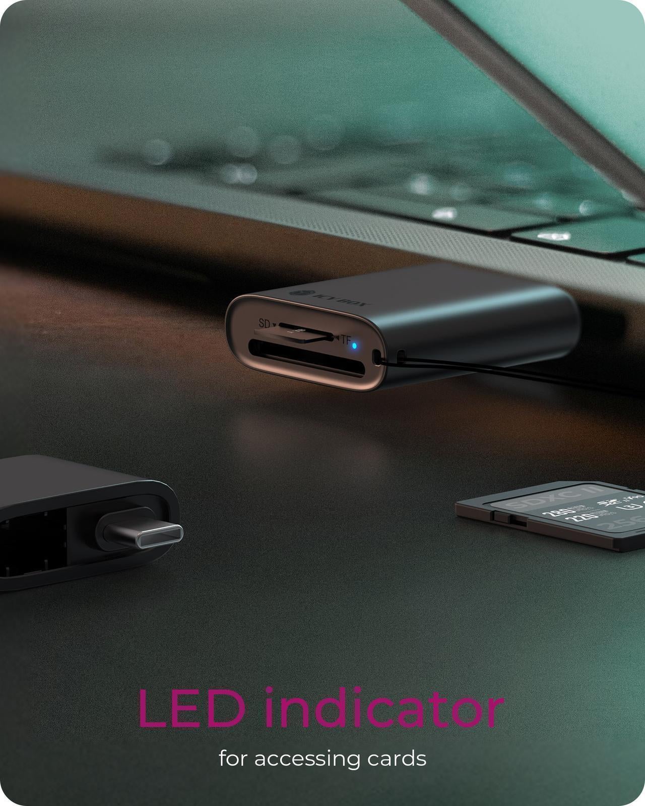 This card reader combines two widely used interfaces: an integrated Type-A connector and an additional Type-C® adapter. It allows users to switch between older computers and the latest USB Type-C® devices. Whether you are switching between devices at home or on the go, this feature guarantees functionality and ease of use.