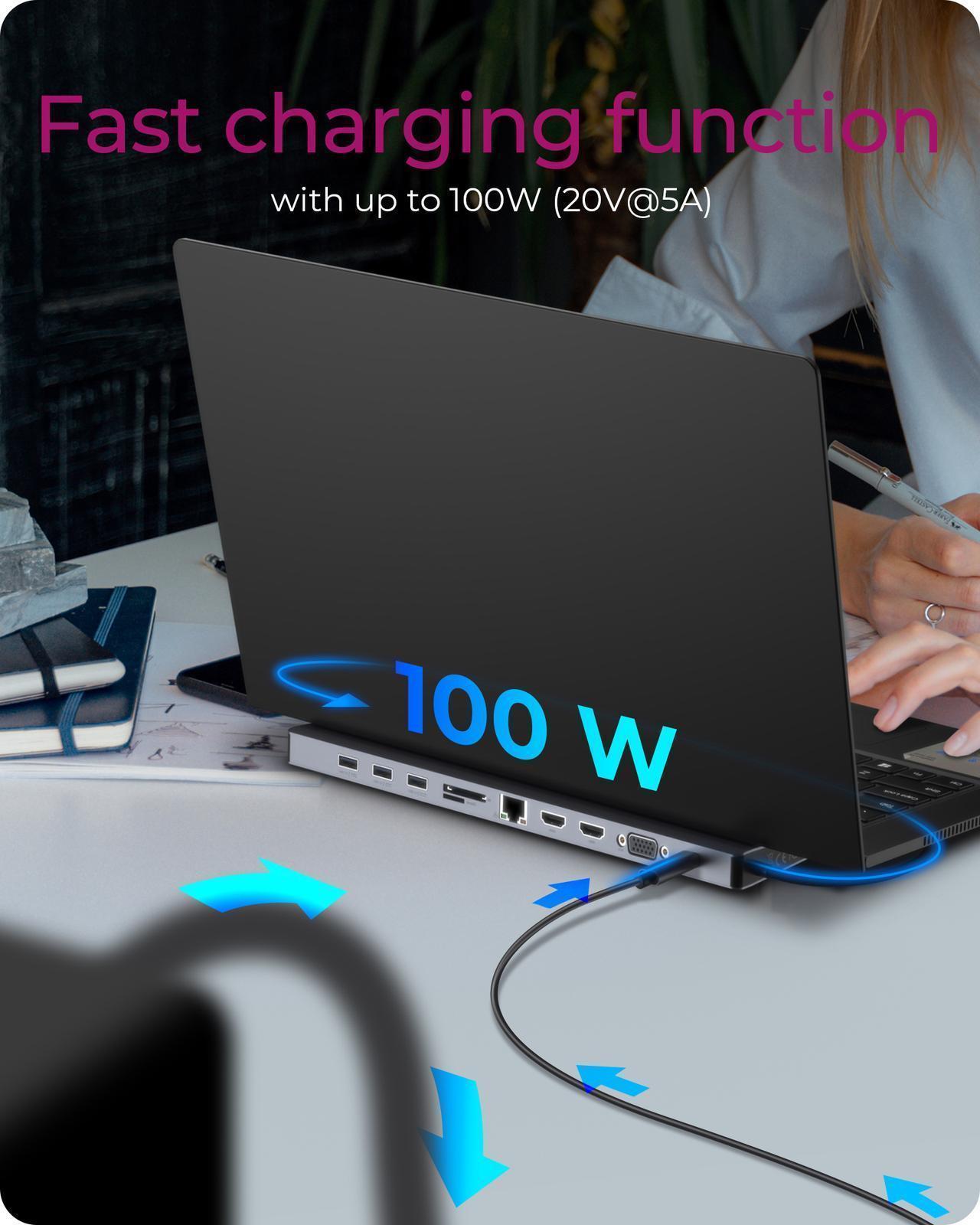 POWER DELIVERY: The Type-C connector of the docking station serves as a pure charging port (no data transfer) with a power of up to 100 W (20 V@5 A). A power supply unit must be connected to the laptop for this purpose.