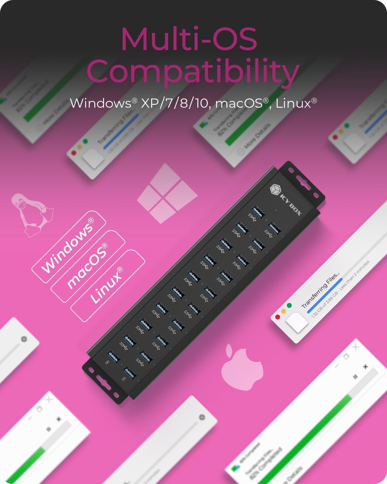 The IB-HUB1720-U3 specialises in handling multiple data transfers with its eighteen USB Type-A ports. Each port supports high-speed data transfer, allowing you to connect and manage several devices simultaneously. Whether you are transferring large files or backing up data, this hub provides fast and reliable operation.